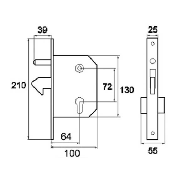Cerradura de gancho para puerta corredera. Conocida también como cerradura para puerta corredera «pico de loro». El pestillo en forma de pico loro actúa como cerradero