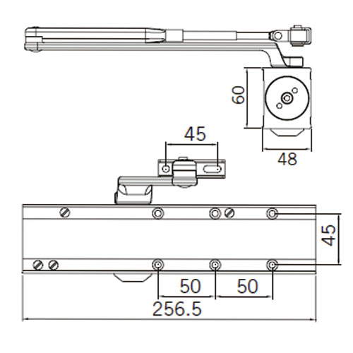 Cierrapuertas con sistema de retención, con una regulación de golpe final y regulación de la velocidad de cierre. Tiene freno de apertura y retardo de cierre.