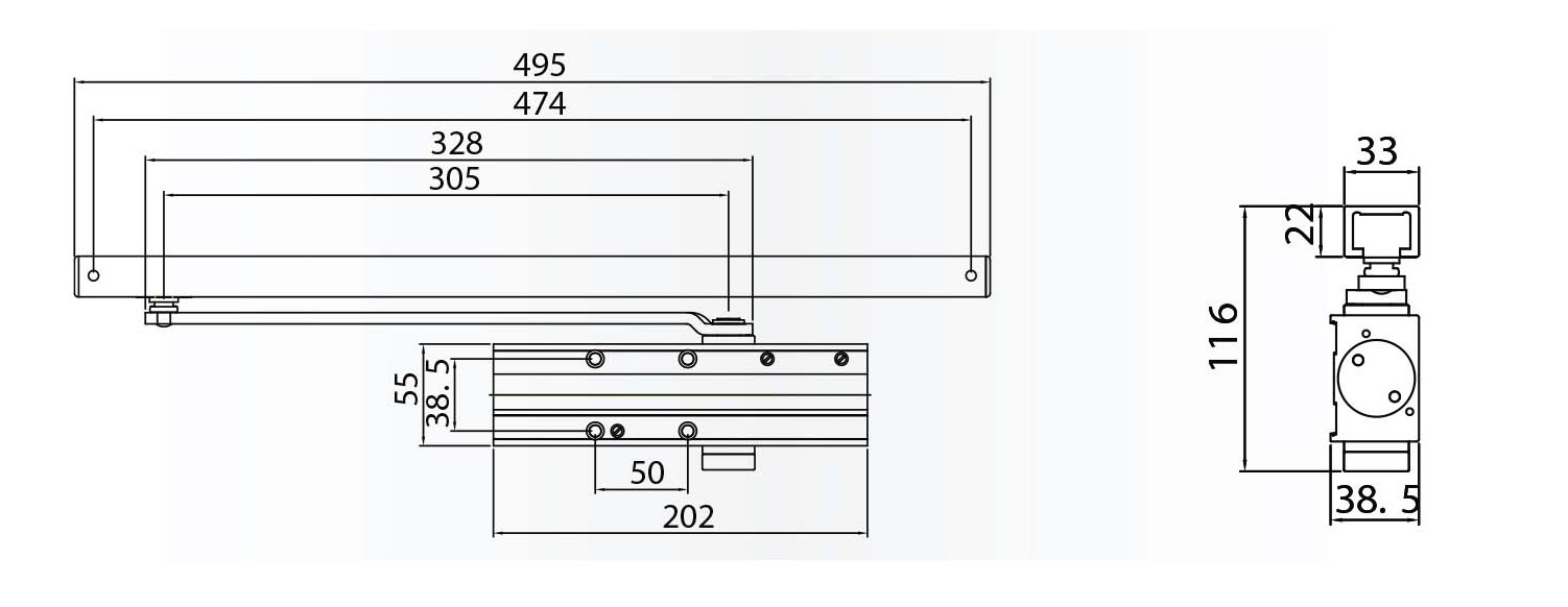 Cierrapuertas sin sistema de retención, con una regulación de golpe final y freno de apertura de la puerta. Fuerza fija de 3.