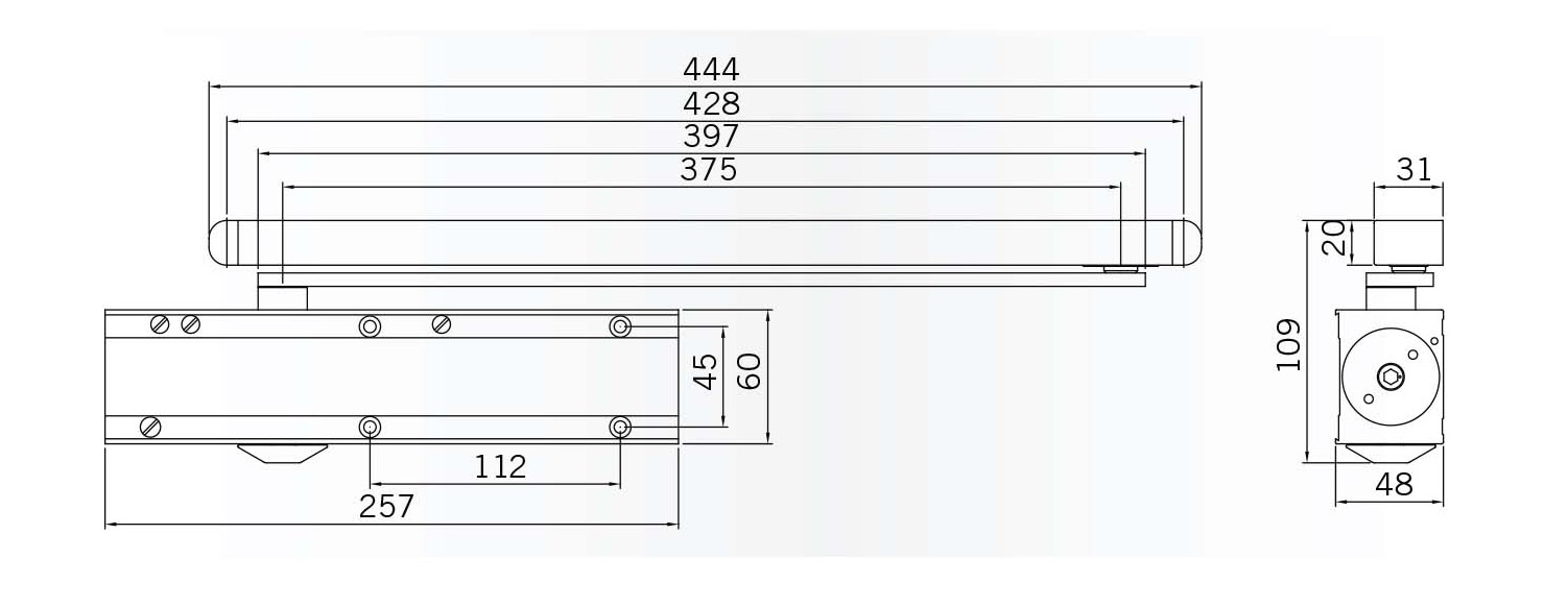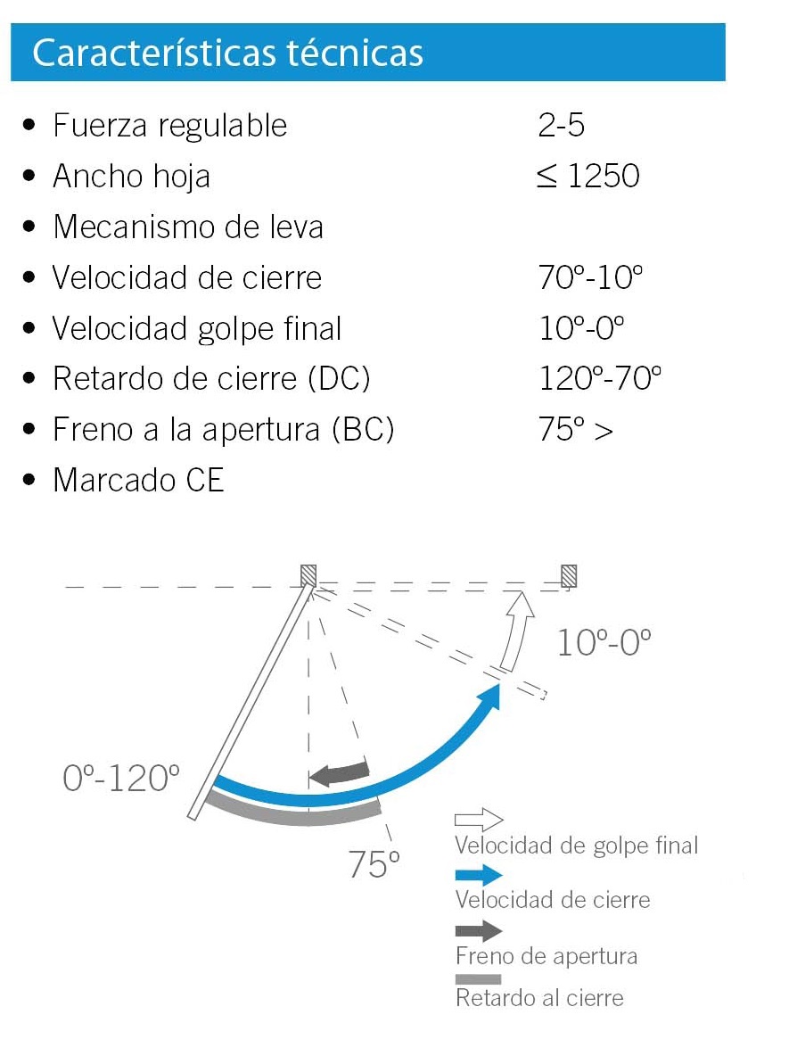 Cierrapuertas sin sistema de retención, con una regulación de fuerza, golpe final, freno de apertura y retardo de cierre. Fuerza regulable de 2-5.