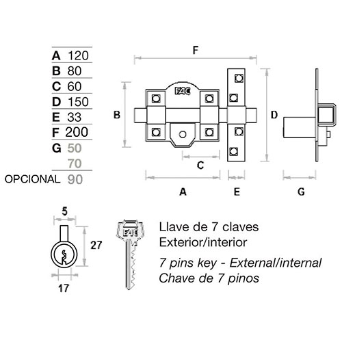 CERROJO FAC 301L/120 LLAVE/LLAVE CILINDRO 70 MM PINTADO