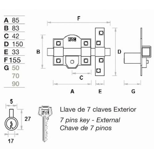 CERROJO FAC 307R/80 LLAVE/PULSADOR NIQUEL DERECHA CON CADENA