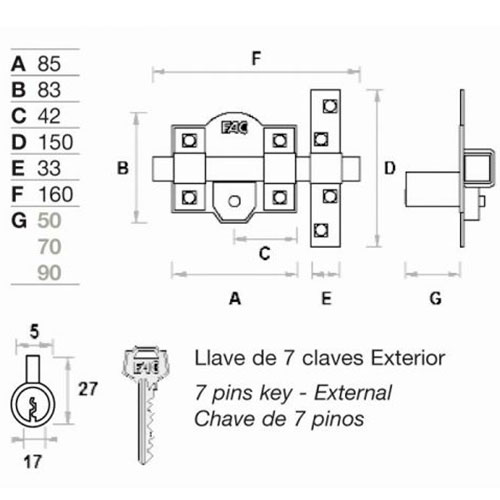 CERROJO FAC 308R/80 LLAVE/PULSADOR NIQUEL IZQUIERDA CON CADENA
