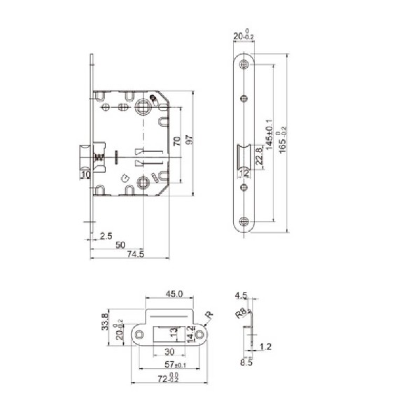 Picaporte de petaca unificado. Distancia entre ejes de 70mm. Inox
