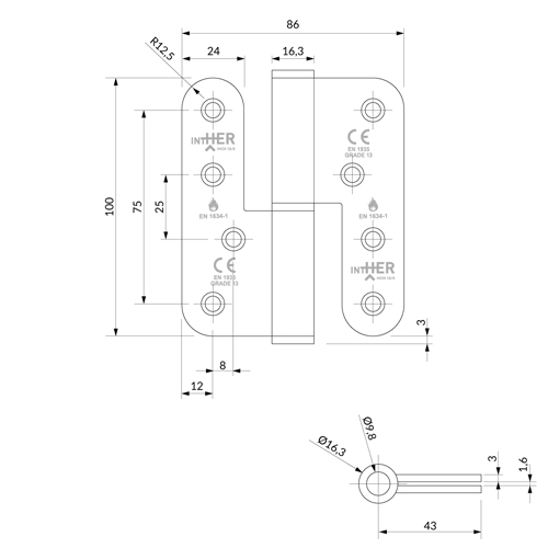 BISAGRA PROYECTO G13 INTHER 1086CR IZDA. 120 Kg INOX 304