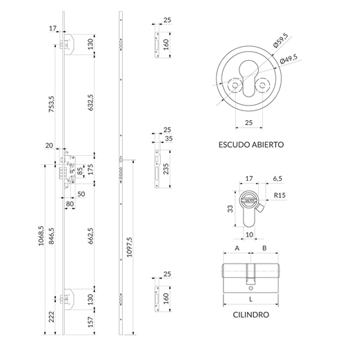 · Cerradura multipunto sobre perfil de acero en U20x10 mm.