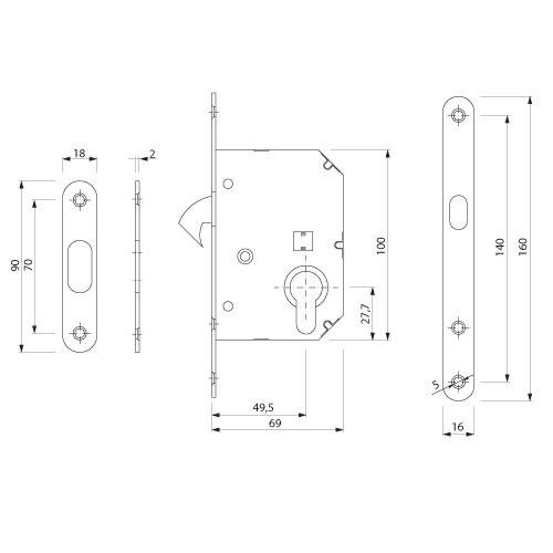 Kit para puertas correderas estándar compuesto por cerradura, bocallave, dedal y cerradero.