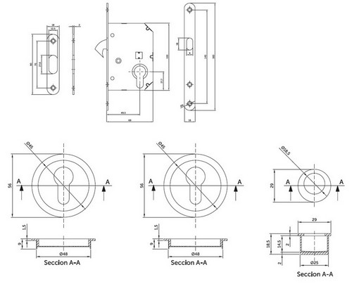 Kit para puertas correderas estándar compuesto por cerradura, bocallave, dedal y cerradero.