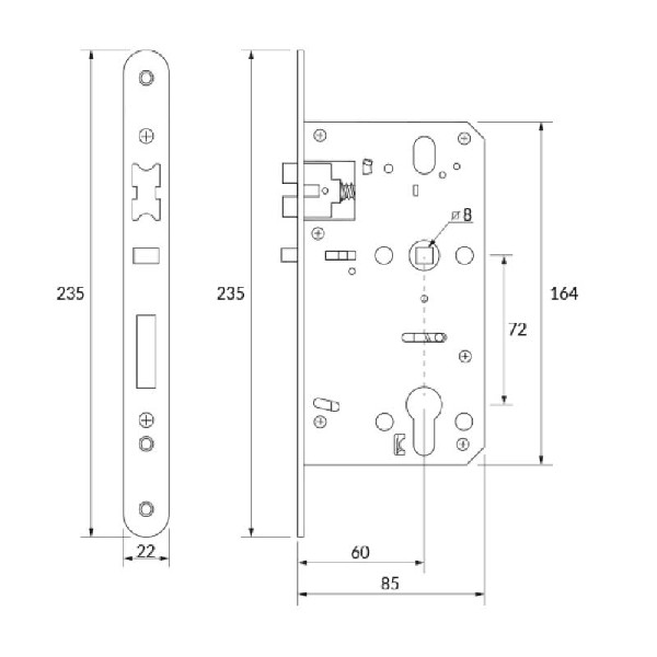 El juego de manillas se suministra con una cerradura anti pánico Reversible con entrada de 35, 50 o 60 mm.
