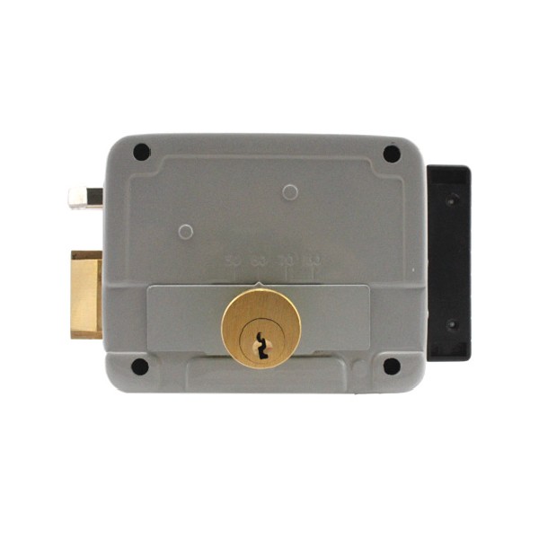 Electrocerradura de sobreponer de 12V con cilindro regulable al centro (50, 60, 70 u 80 mm), con pulsador.
