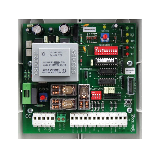 Cuadro de maniobra alimentado a 230V sin radio integrada diseñado especialmente para motores de puertas batientes de 1 hoja y basculantes.