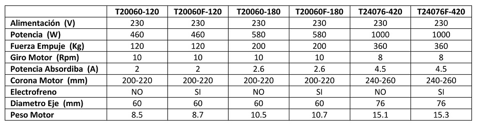 Alimentación motorAlimentación motor 230 Vac 230 VacAlimentación motor 230 VacPeso máximo puertaPeso máximo puerta 120 kg 120 kgPeso máximo puerta 120 kgDimensión máxima puertaDimensión máxima puerta 7 m2 7 m2Dimensión máxima puerta 7 m2Potencia motorPotencia motor 460 W 460 WPotencia motor 460 WCorriente absorbidaCorriente absorbida 2 A 2 ACorriente absorbida 2 AGiro motorGiro motor 10 rpm 10 rpmGiro motor 10 rpmCondensadorCondensador 16 uF 16 uFCondensador 16 uFPeso motorPeso motor 8,5 – 8,7 Kg 8,5 – 8,7 KgPeso motor 8,5 – 8,7 KgTemperatura de funcionamientoTemperatura de funcionamiento -20ºC / +80ºC -20ºC / +80ºCTemperatura de funcionamiento -20ºC / +80ºCLímite térmicoLímite térmico 150ºC 150ºCLímite térmico 150ºCFinales de carreraFinales de carrera Mecánicos MecánicosFinales de carrera Mecánicos