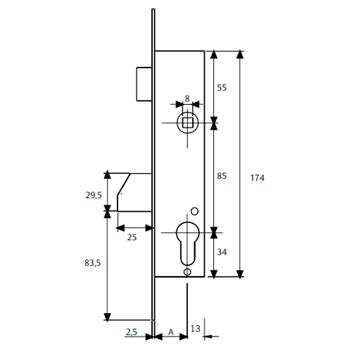 CERRADURA TESA 2210-38 mm SSI SIN ESCUDO, SIN CERRADERO