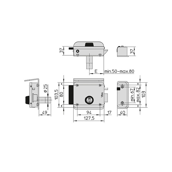 Electrocerradura VIRO de sobreponer de 12V con cilindro regulable al centro (50, 60, 70 u 80 mm)